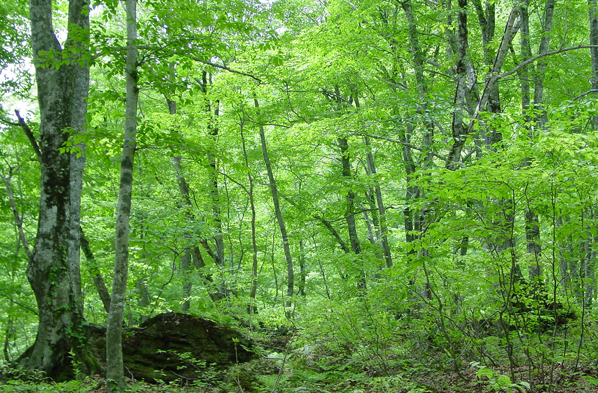 藤琴川の上流、藤里駒ヶ岳と三蓋山の二つの高い山に挟まれた標高620mの台地状のところにあります。ブナを主体とする天然林で、世界遺産地域の周辺区域として、核心地域(立入禁止の地区)の様相を体験できる森の一つとされています。 林内にはブナの実生から稚幼樹、幼木、成木、老木に至る成長過程がよく観察でき、また、歩道や木道が整備されており、森林浴や森林環境教育によく活用されています。