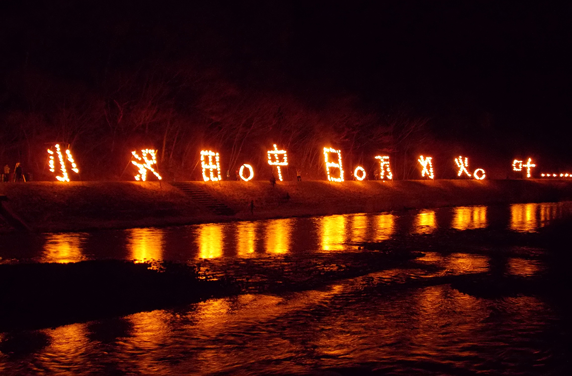 古くから小阿仁川流域に伝わる、小高い丘や田園に灯りを灯し、祖先の霊を供養する伝承行事です。春彼岸の中日(春分の日)の日没後、村内の15集落で灯油を染み込ませた布を丸めたもの(ダンポ)で火文字を描きます。点灯時間に合わせ無料鑑賞バスを運行しています。 当日は道の駅かみこあで出店や花火などのイベントを開催しています。