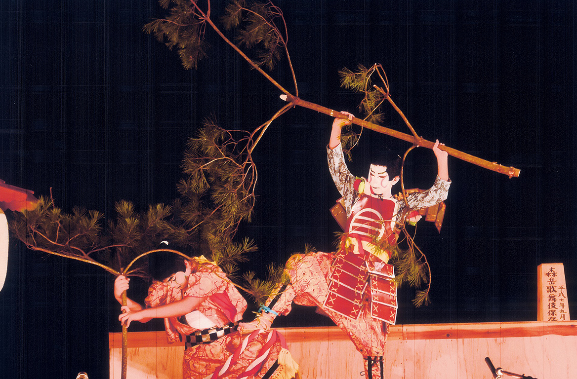 にかほ市象潟「大森歌舞伎」と並んで県内に残存する地歌舞伎の一つ。毎年、旧暦8月15日の神社祭礼に神賑(しんしん)行事として演じられてきました。現在では、森岳神社境内の農村歌舞伎会館において奉納演舞されています。