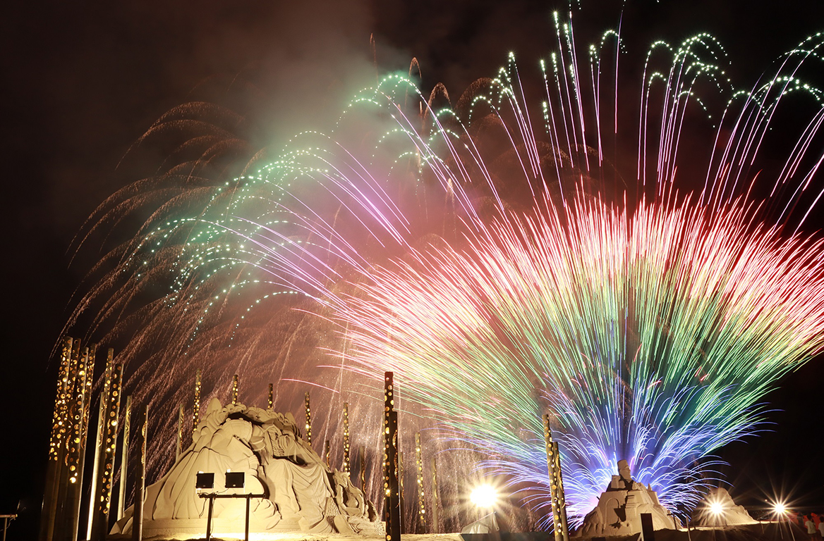 釜谷浜海水浴場を会場に開催される砂像制作展示のイベント。プロの砂像彫刻家や一般参加者が制作する大小の砂像が約30基ほど並びます。イベント当日にはステージイベントや海上花火ショーなどが行われ、三種町の夏を彩ります。砂像の展示は8月いっぱいまで行われ、夜間はライトアップにより砂浜を幻想的に演出します。